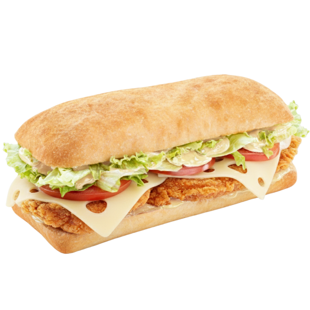Son long pain ciabbata avec son filet de poulet et son emmental fondu raviront les amateurs